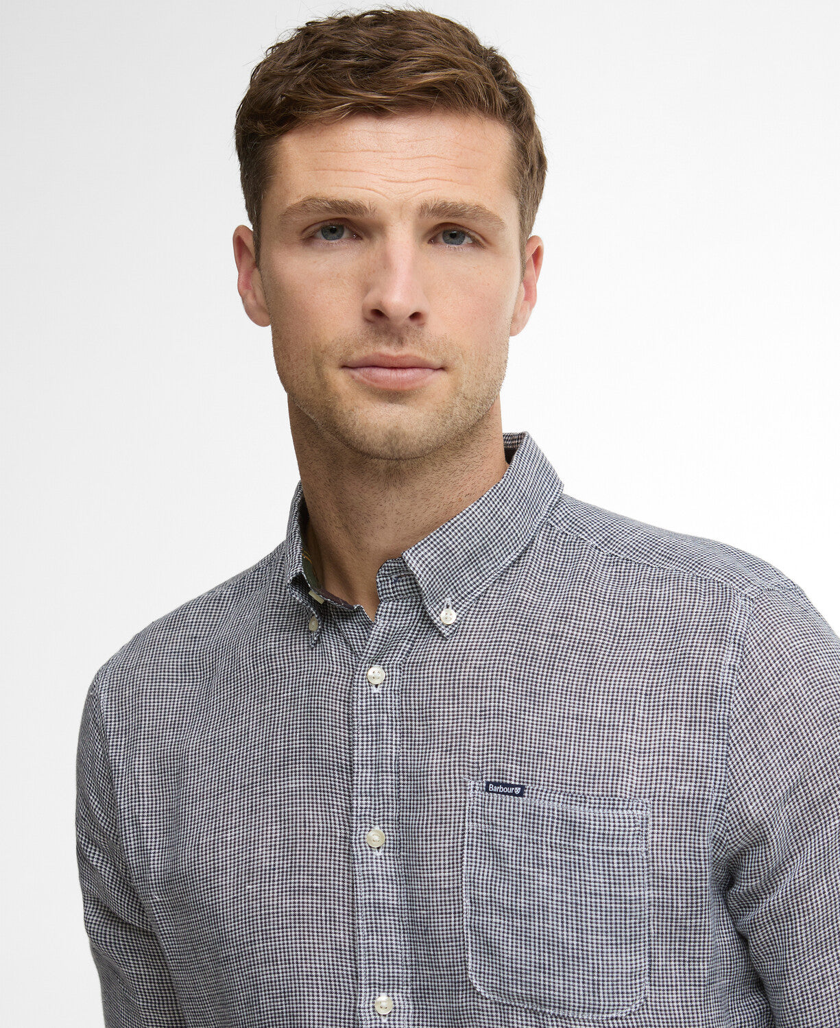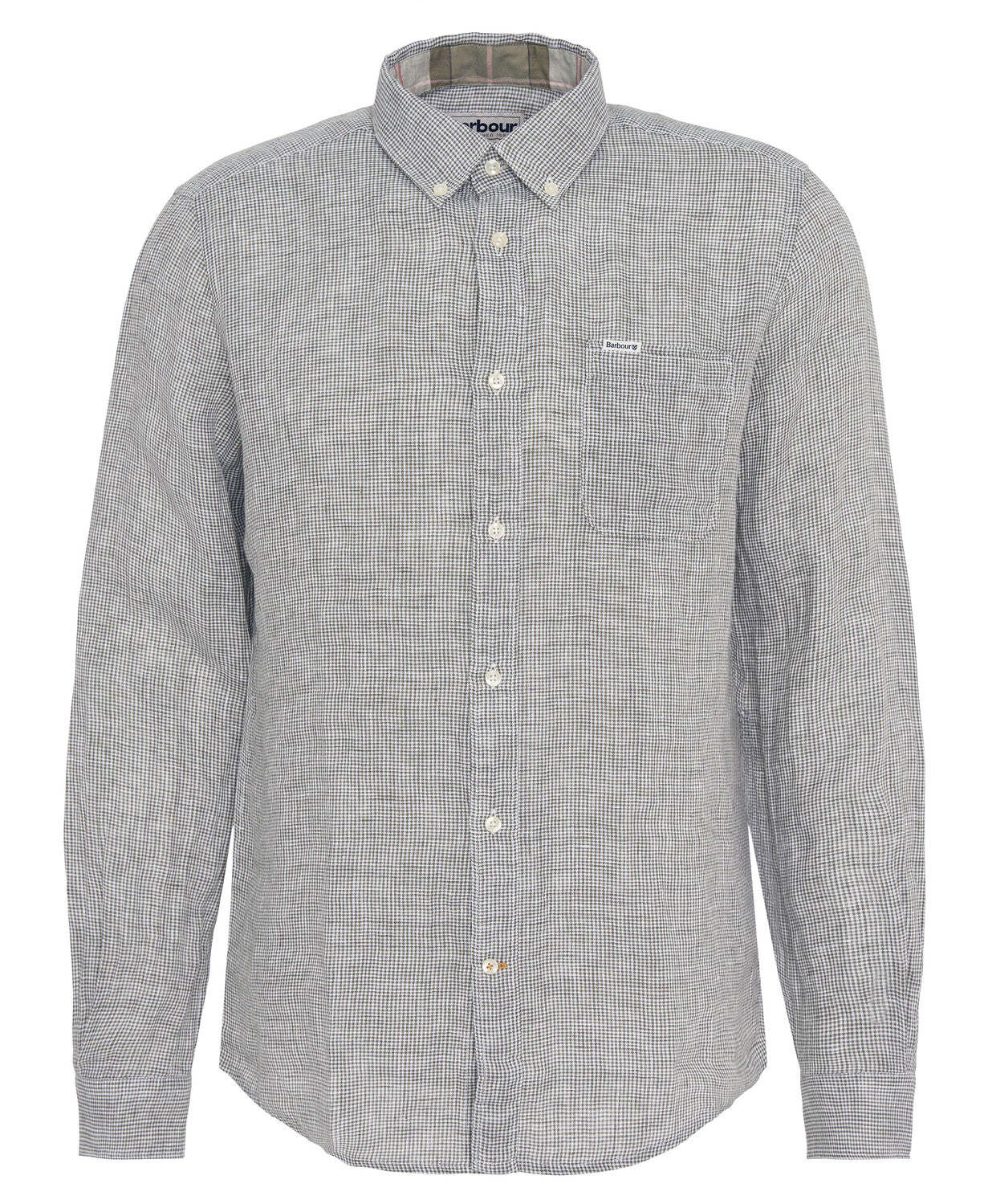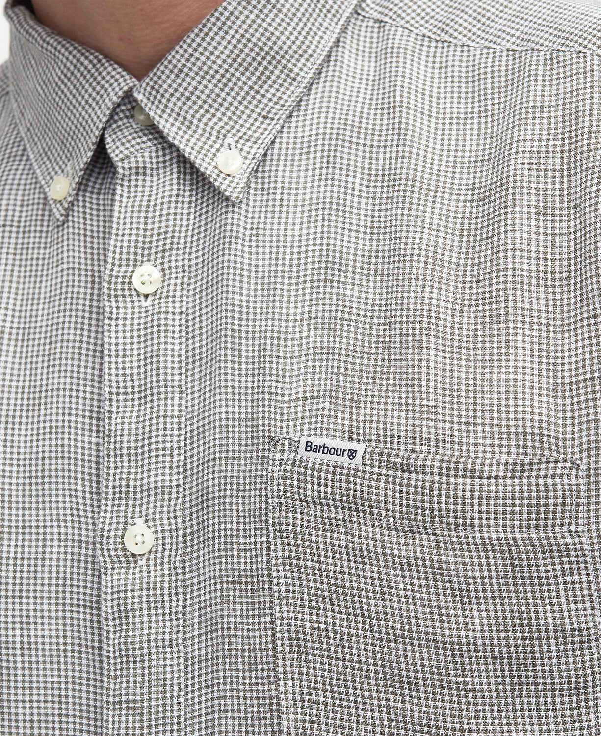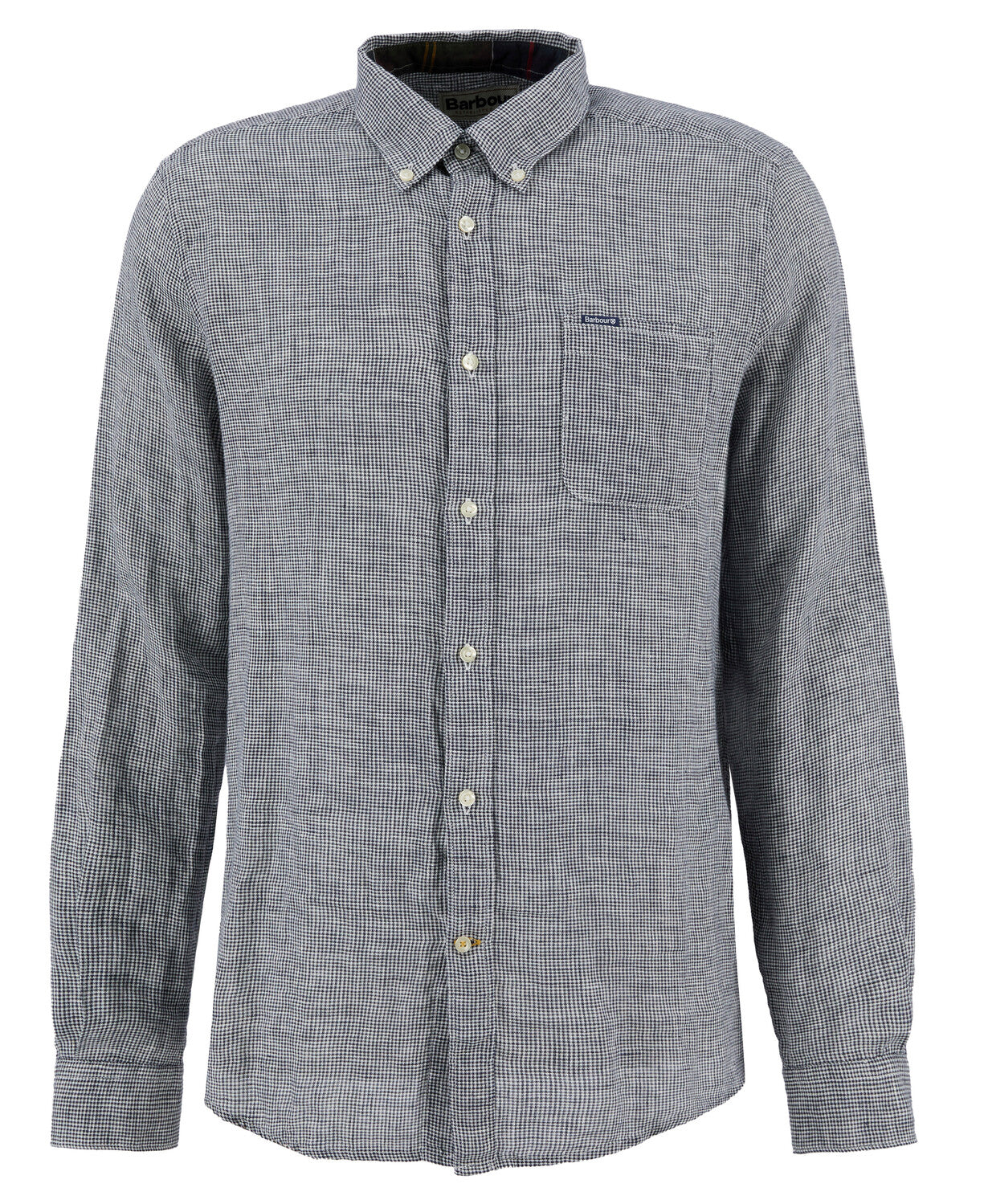 Ova košulja uskog kroja odiše suvremenom profinjenošću i izrađena je od 100% lana u mikro karo uzorku (houndstooth), s mekanim završnim slojem.