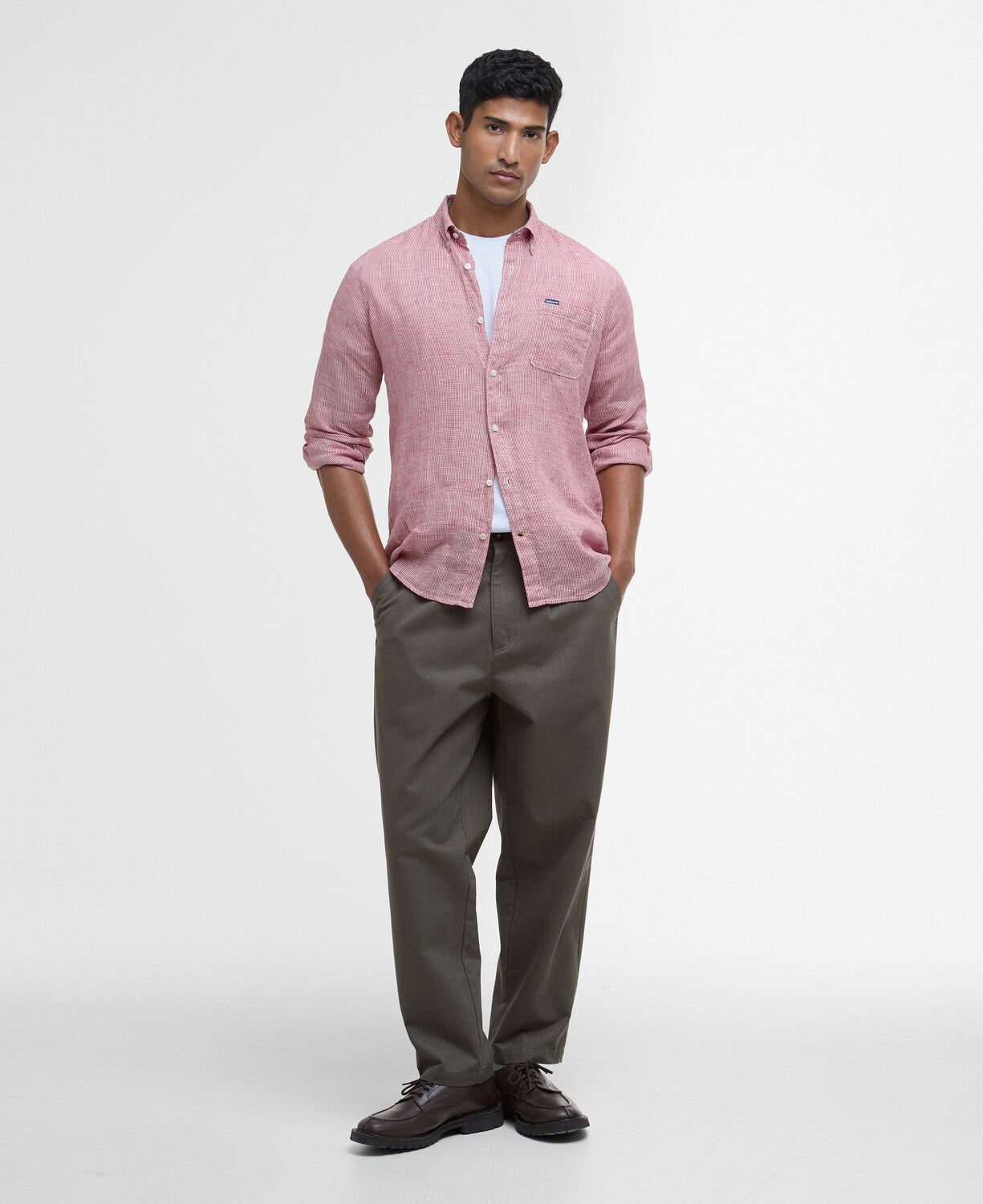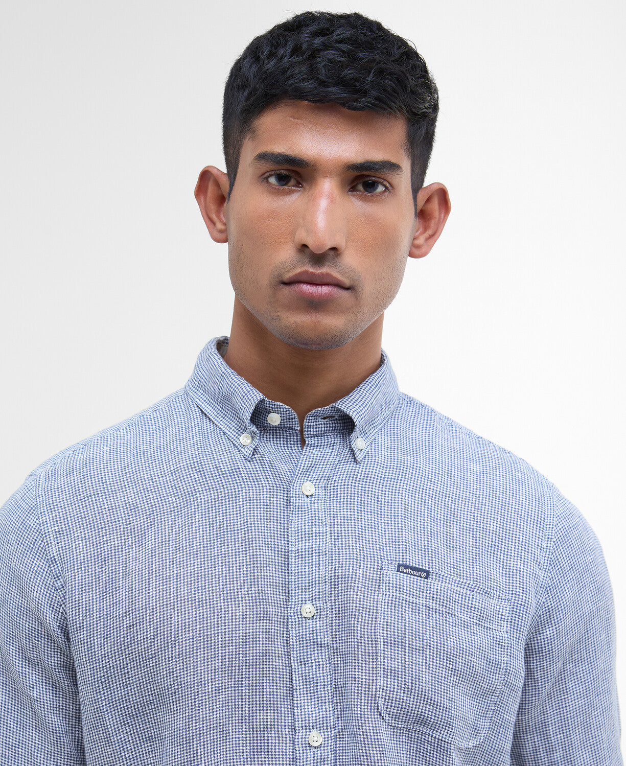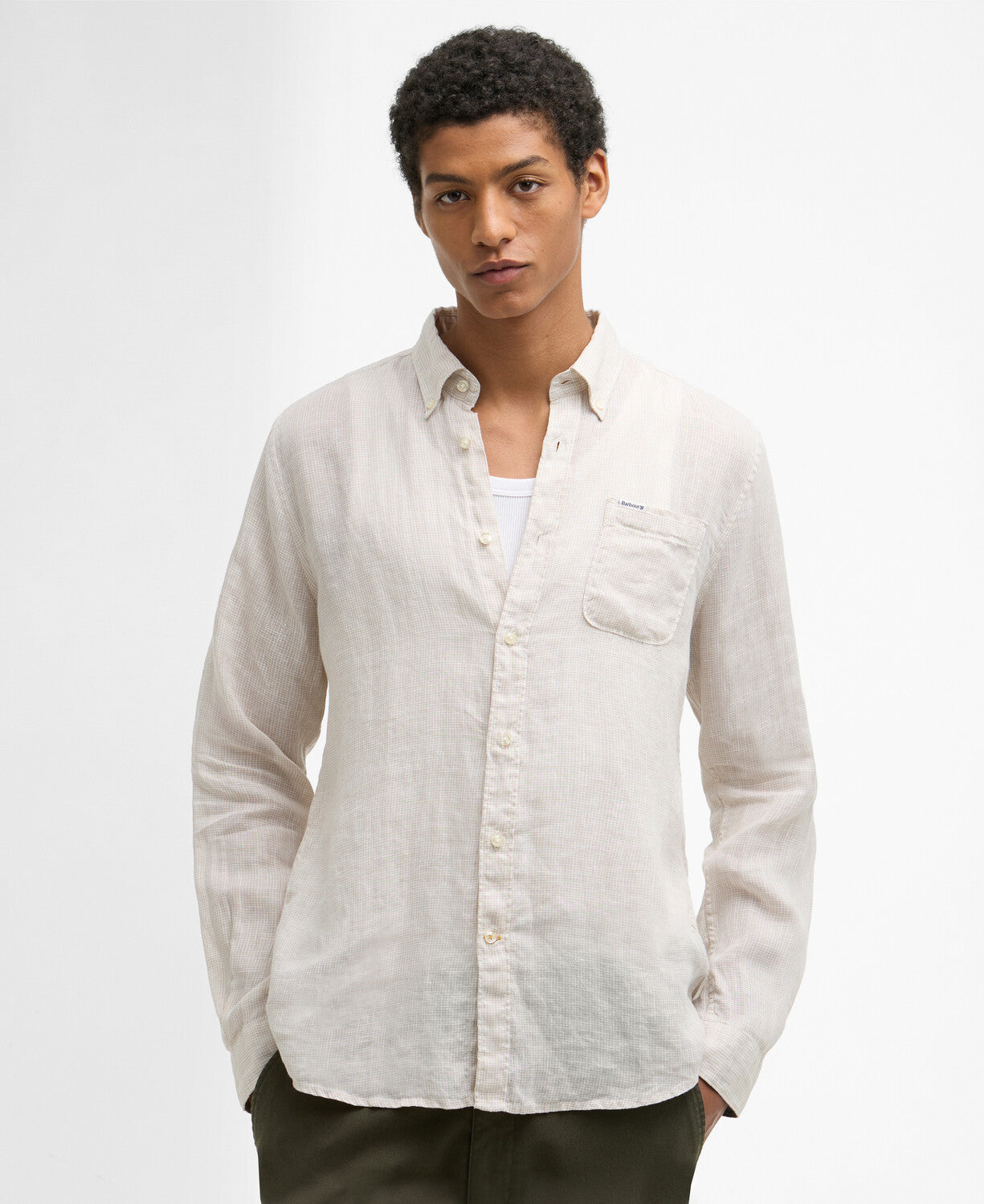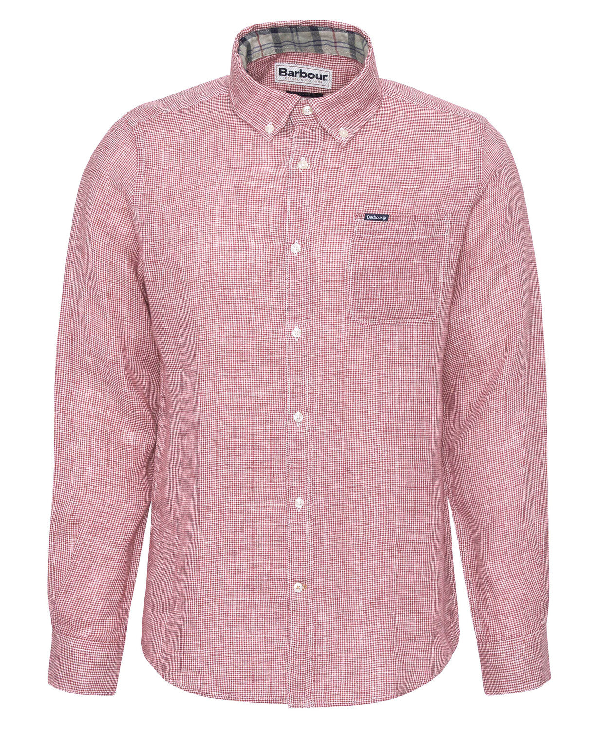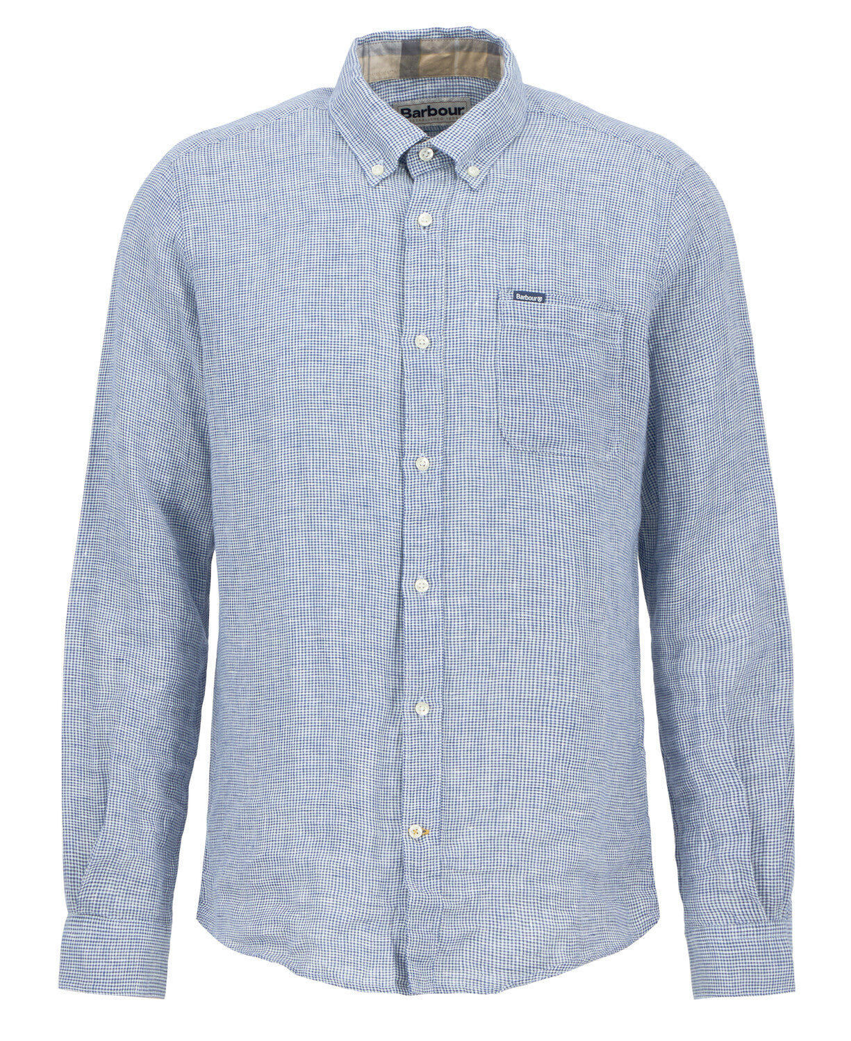 Ova košulja uskog kroja odiše suvremenom profinjenošću i izrađena je od 100% lana u mikro karo uzorku (houndstooth), s mekanim završnim slojem.