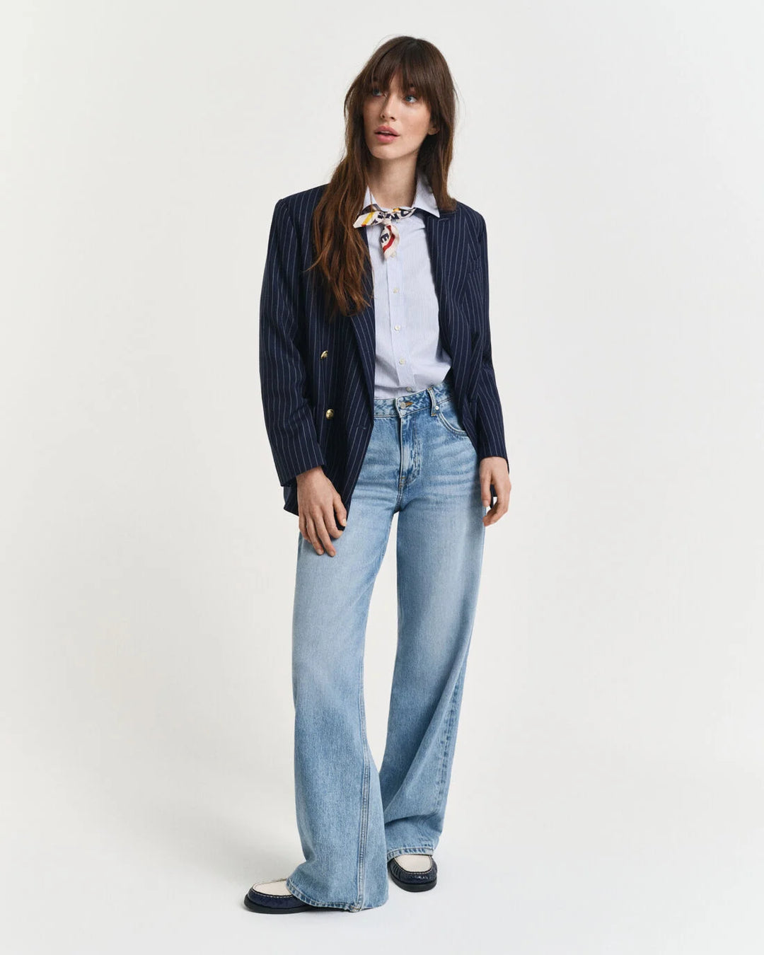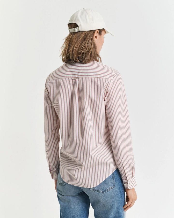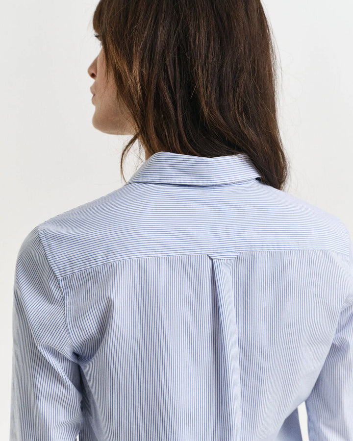 Izrađena od izdržljivog poplinskog tkanja, ova košulja je neophodna za svaku preppy garderobu. S prugastim printom po cijeloj površini i klasičnim GANT logotipom u tonu izvezenim na prsima, košulja ima zakrivljeni rub, podesive manžete i špicasti ovratnik. Dizajn je upotpunjen naborima i našom prepoznatljivom petljom za zaključavanje straga.