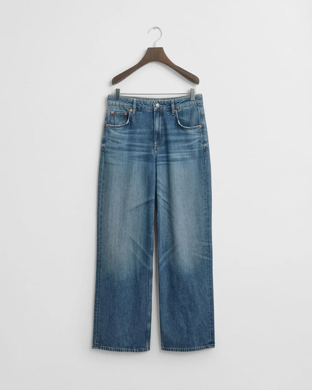 Ove traperice opuštenog kroja izrađene su od certificirane mješavine recikliranog pamuka i liocela. Dizajnirane u srednje indigo boji s izražajnim pranjem, krojene su do sredine struka, uske preko bokova i ravne na nogavicama. Detalji uključuju prednji otvor s krišnim zatvaračem i prepoznatljiv brend na gumbima, zakovicama i stražnjoj etiketi na struku.