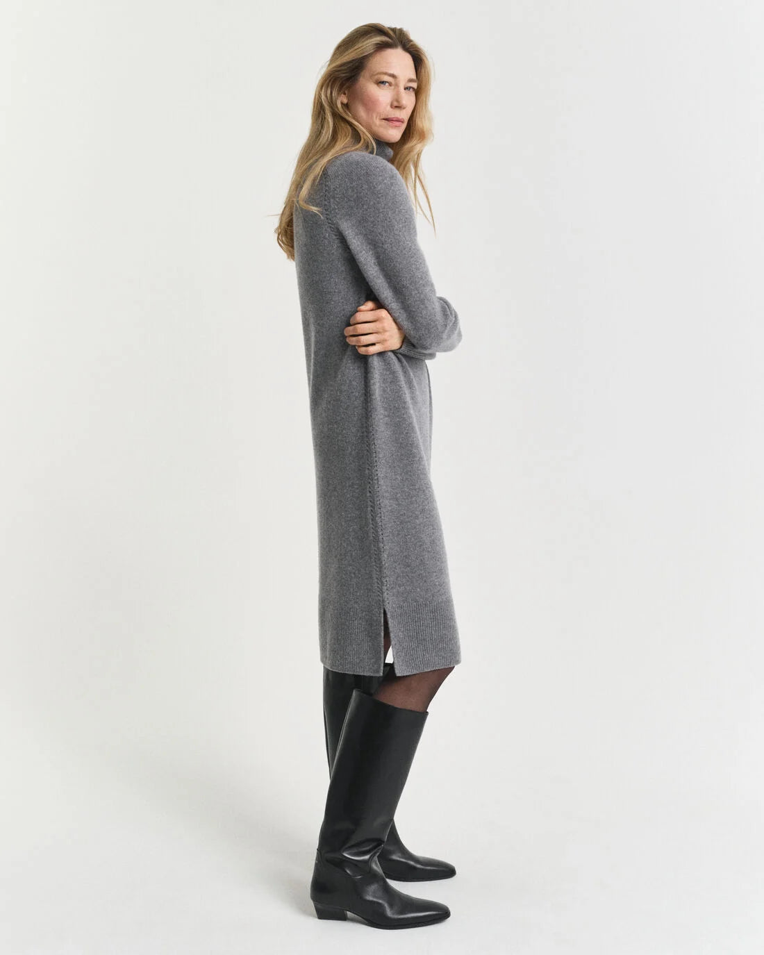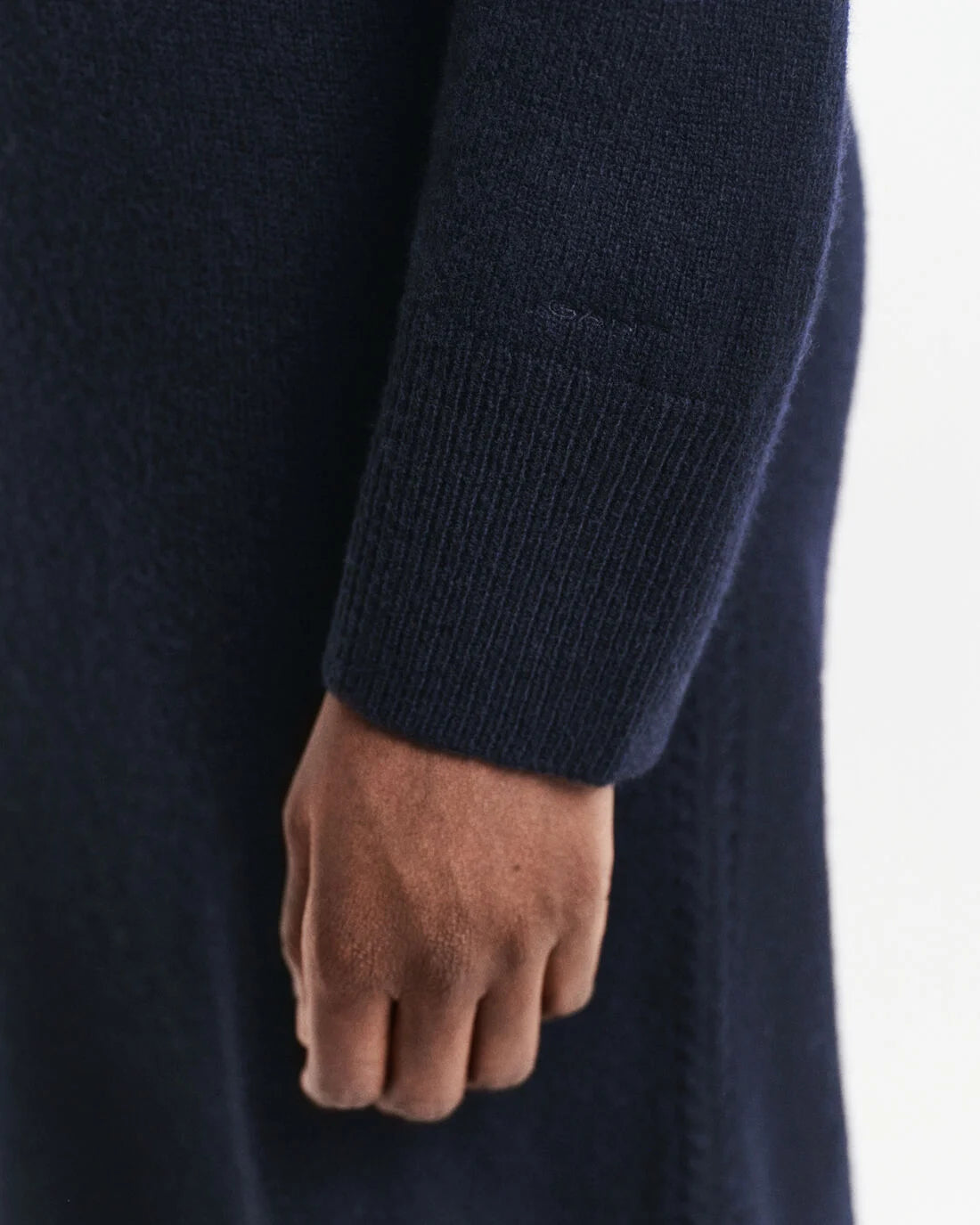 Izrađena od super mekane mješavine talijanske janjeće vune i kašmira, ova haljina je krojena za opušteni kroj i završava odmah ispod koljena. Dizajn ima dolčevitu kragnu, visoke rebraste manžete i rub te vez GANT logotipa na rukavu. Ovaj odjevni predmet namijenjen je opuštenom kroju. Za uži kroj preporučujemo manju veličinu.