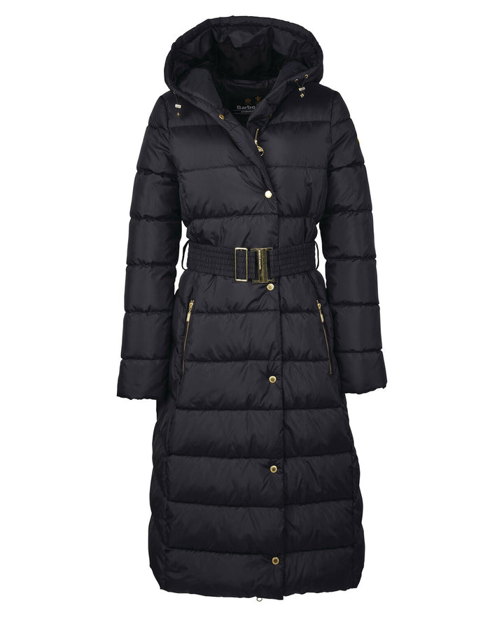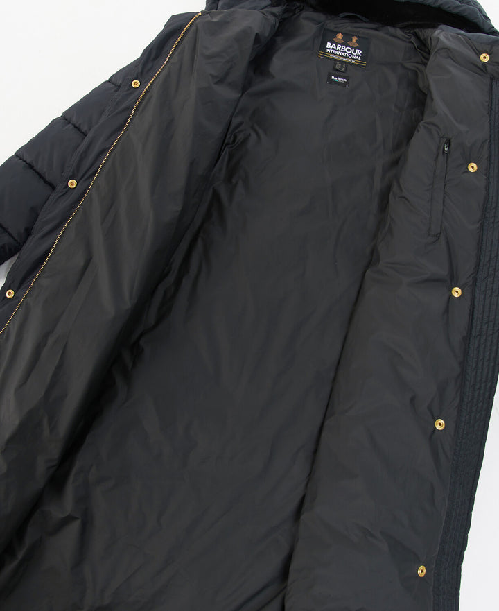 Prošivena jakna Barbour International Track Line može se pohvaliti elastičnim remenom u struku za ženstvenu siluetu, ova jakna nudi ravni prošiv s pregradom sprijeda i prošivanje u obliku ševrona na leđima. Markiranje na rukavu bez napora dovršava odjevni predmet.