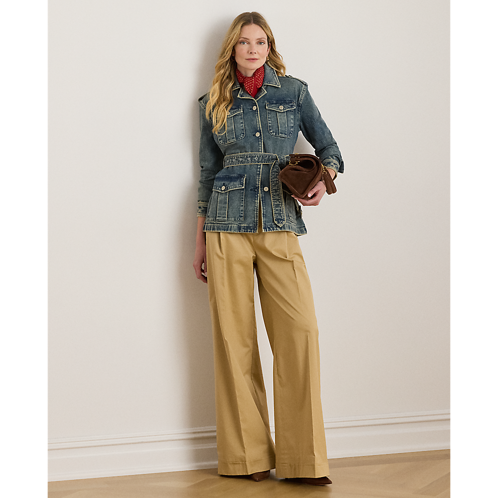 Savršena za prijelazna godišnja doba, ova moderna interpretacija klasične field jakne izrađena je od laganog trapera i inspirirana je vojničkim stilom. Sadrži epoletice na ramenima, praktične džepove s preklopom te remen u struku s kopčom obloženom imitacijom kože za elegantnu siluetu.