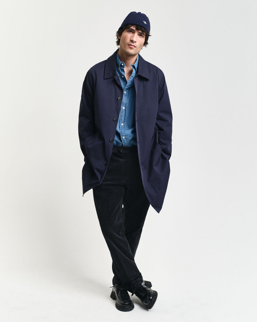 Izrađen od premijske mješavine pamuka, ovaj kaput automobilske dužine osnovni je komad vanjske odjeće. Krojen je u regularnom fitu i završava neposredno iznad koljena. Dizajn je bez konstrukcije i ima centralni zatvarač sprijeda s 5 gumba. Detaljiziran je džepovima sa svilenim rubovima, a kaput je također opremljen ventilacijskim otvorom na stražnjem dijelu, petljom za vješanje i dva unutarnja džepa.