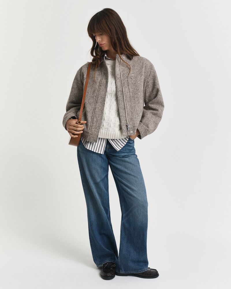 Po uzoru na robusnu radnu odjeću, ova bluzon jakna izrađena je od autentične vune s prošaranim nitima i u potpunosti je podstavljena mješavinom certificirane viskoze i recikliranog poliestera. Krojena za regularni kroj koji se proteže na bokovima, ovratnik u stilu košulje unosi teksturirani kontrast u odjevni predmet. Ostali detalji dizajna uključuju prednje bočne džepove, unutarnji džep i elastični rub na stražnjem pojasu. Ova jakna se zatvara skrivenim dvostrukim patentnim zatvaračem na prednjem razrezu, plus nevidljivim drukerima sprijeda i na manžetama rukava.