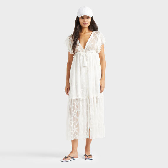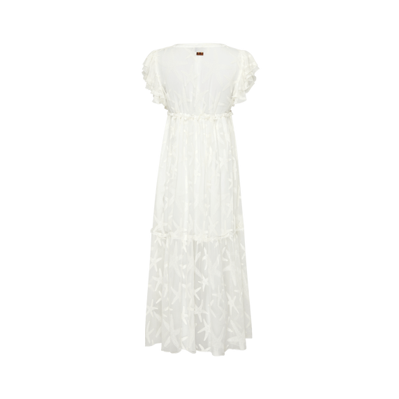 Izvrsna duga ljetna haljina bogato izvezena zvjezdicama s tonovima iste boje. Izrađena od svile crepon chiffon, haljina pruža lepršavi osjećaj, a flounce rukavi i V-izrez dodaju laskavi završni dodir.