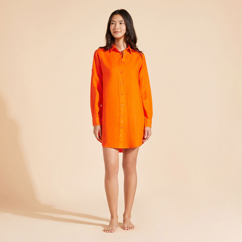 Navuci Fragance žensku košulju-haljinu preko kupaćeg kostima nakon svakodnevnog plivanja. Lagana i lebdeća lanena tkanina posebno je udobna, što je čini savršenom za opuštene praznike. Njegov široki kroj i dugi rukavi čine ovu običnu košulju vrhunskim ležernim šikom.