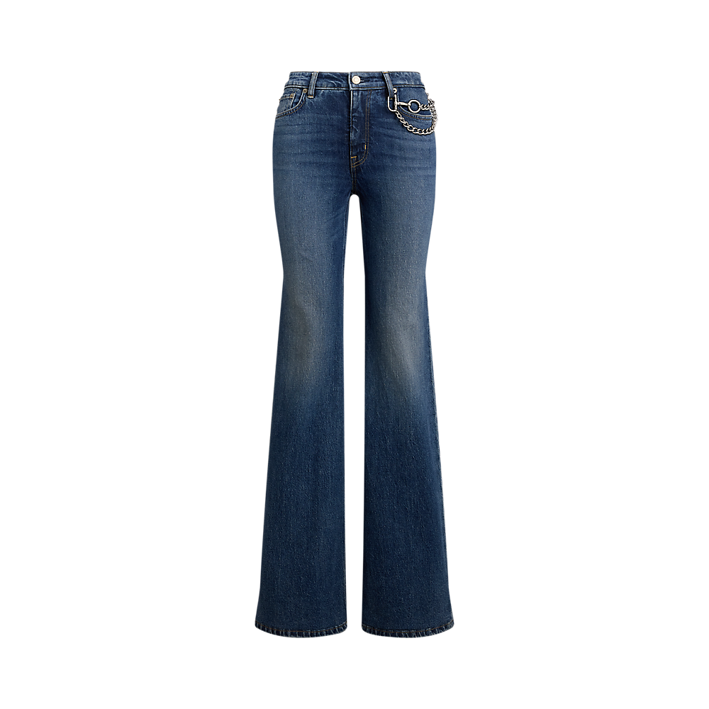 Krojene za proširenu siluetu koja izdužuje noge, ove traperice visokog struka izrađene su od udobnog kepera za lijevu ruku koji nudi dovoljno rastezljivosti za opušteno pristajanje i osjećaj. Ova verzija odaje počast Ralph Laurenovom duhu inspiriranom jahanjem s odvojivim ukrasom u obliku lančića za konje na lijevom struku.