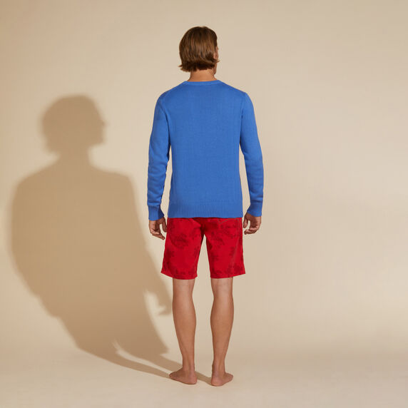 Pulover s okruglim vratom koji kombinira mekano pamučno i kašmirsko pletivo, duge rukave, okrugli vrat i kornjaču s potpisom na torzu.