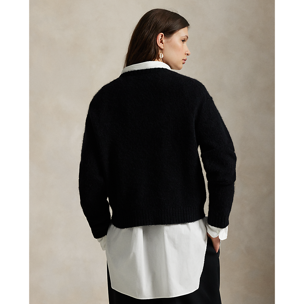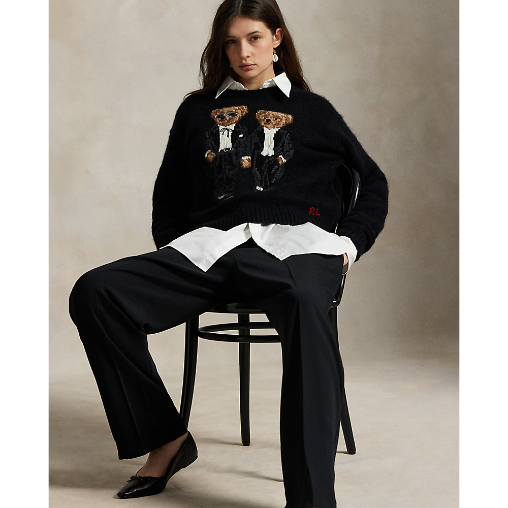 Ovaj pulover od mješavine vune s okruglim izrezom prikazuje dva Polo Beara u svojoj najboljoj crnoj kravati - inspiriran kultnom fotografijom gospodina Laurena pored svoje supruge i muze, Ricky Lauren.