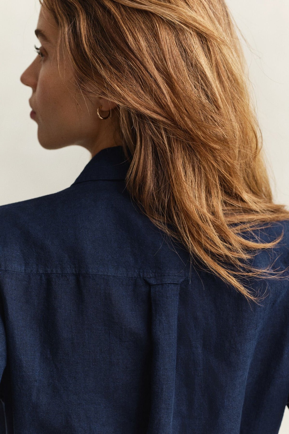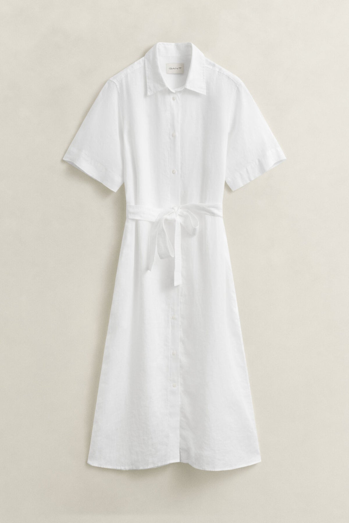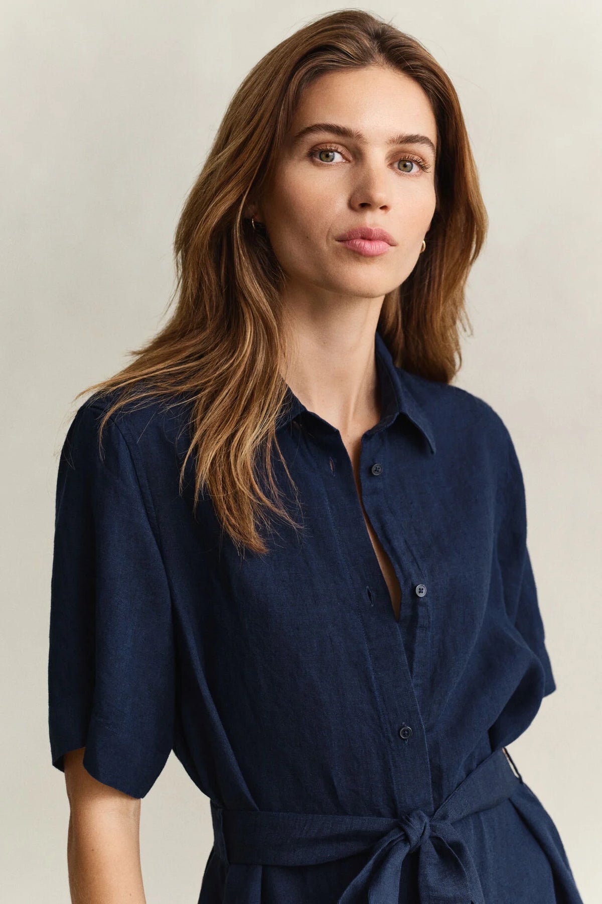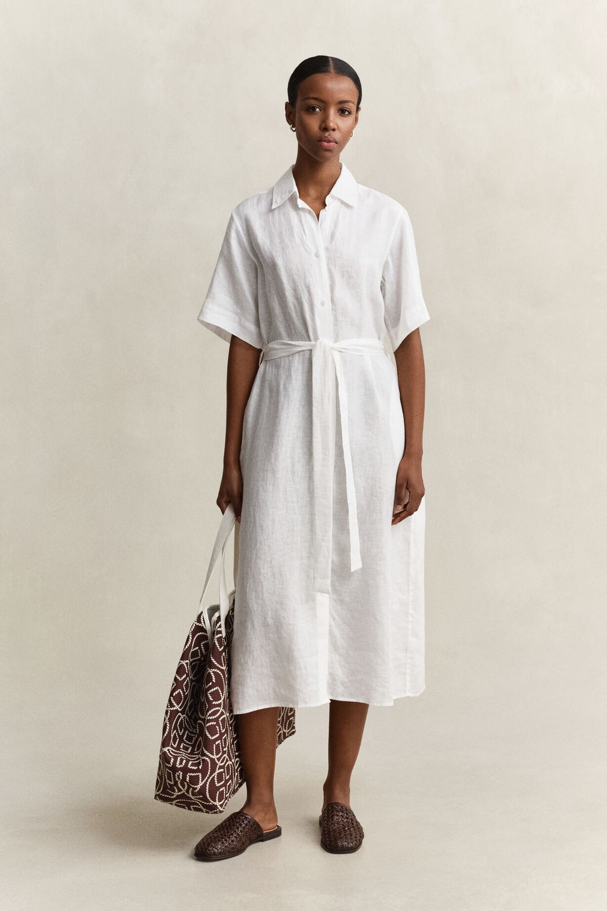 Izrađena od certificiranog europskog lanenog platna, prirodno prozračnog i laganog vlakna, ova haljina kratkih rukava dizajnirana je za regularni kroj s duljinom do sredine teleta. Ima elegantan kroj inspiriran košuljom koji se steže u struku remenom s vezanjem. Ostale značajke dizajna uključuju špicasti ovratnik, bočne džepove, francuski kopčanje s gumbima i nabore s našom prepoznatljivom petljom za zaključavanje straga.