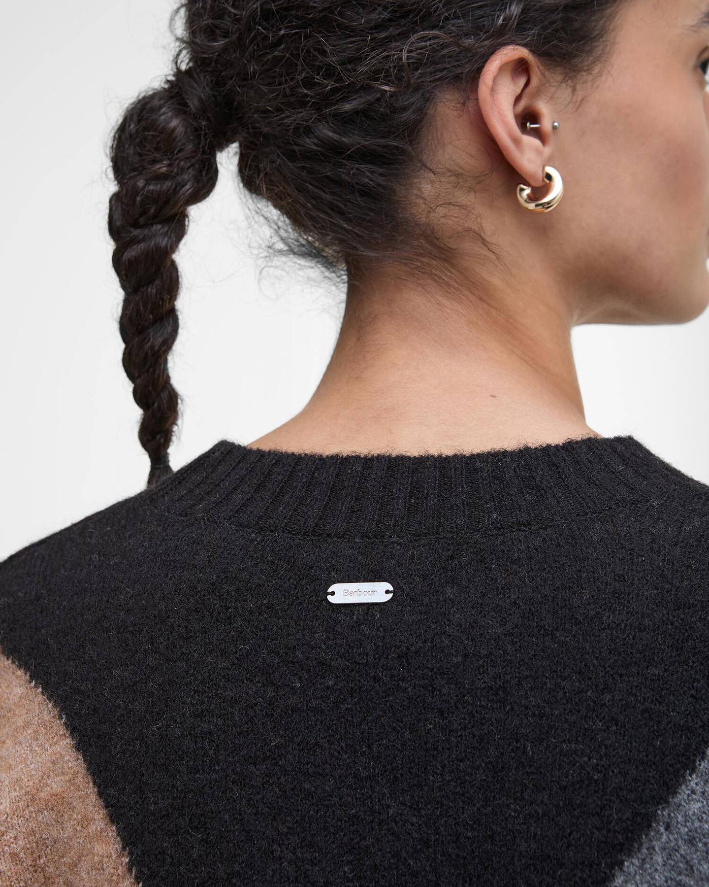Istaknite se stilom uz Barbour Sabrina džemper s okruglim izrezom. Izrađen od vrhunske mješavine bogate vunom, ovaj odvažni trobojni džemper ima jumbo dijamantni dizajn u neutralnim bojama, što ga čini jednostavnim izborom za stiliziranje u hladnijim mjesecima.