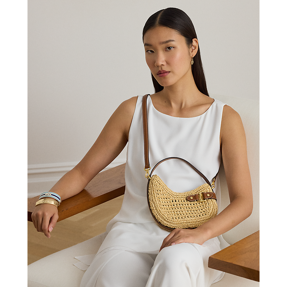 Mala torba Tasha ručno je heklana od papirnate slame i ukrašena mekim obrubom od punozrnate kože. Inspirirana je konjičkom estetikom, s prepoznatljivim D-prstenom i modernom, zakrivljenom asimetričnom siluetom. Zahvaljujući gornjoj ručki i odvojivom, podesivom remenu za nošenje preko tijela, nudi više mogućnosti stiliziranja.