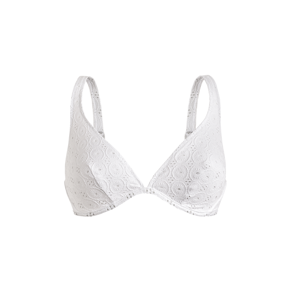 Bikini top s žicom, izrađen od delikatne rastezljive Broderie Anglaise tkanine, pruža laskav fit. Zatvara se kopčom na leđima i ima podesive naramenice za veću udobnost.
