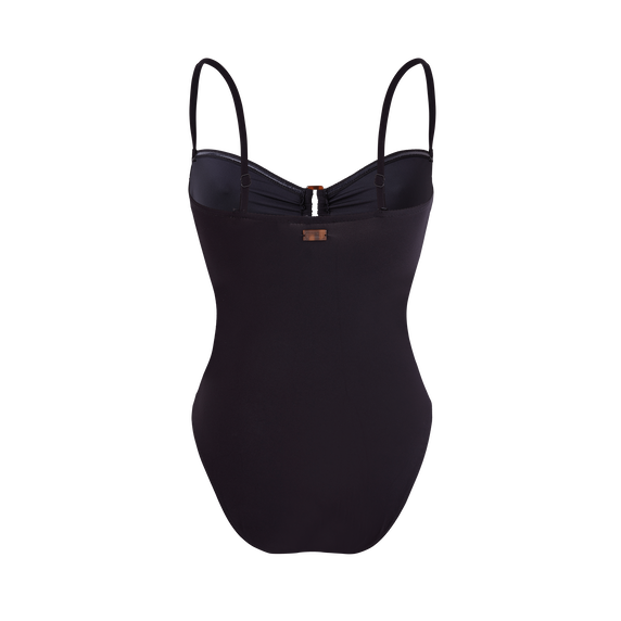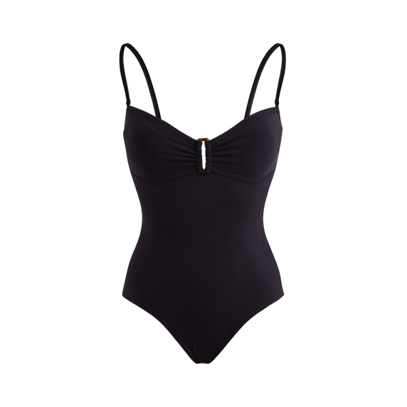 Elegantni jednodijelni kupaći kostim izrađen od elastične tkanine savršeno oblikuje tijelo, dok uklonjive naramenice omogućuju više stilova nošenja. Na prednjem dijelu nalazi se dekorativni prsten koji imitira kornjačin oklop, a straga pločica s Vilebrequin logotipom za profinjeni završni dodir.
