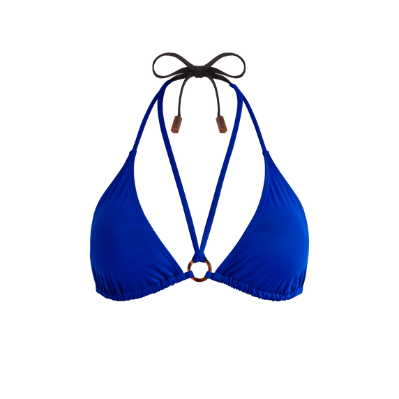 Triangular bikini top s imitacijom kornjačinog oklopa i vezicama na vratu i leđima, ukrašenim Vilebrequin metalnim vrhovima. Uklonjivi ulošci poboljšavaju oblik, dok dodatna naramenica na vratu dodaje detalj.