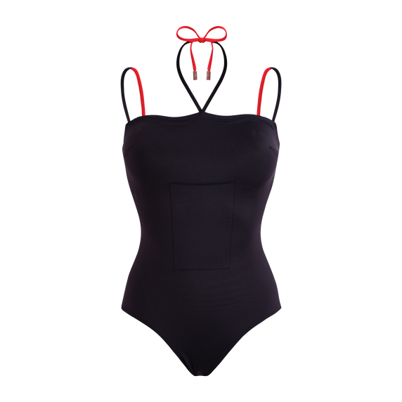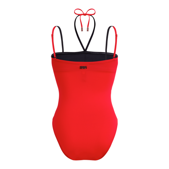 Elegantan kupaći kostim s crnom prednjom stranom i upečatljivom stražnjom stranom u boji crvenog ruža za sofisticirani izgled. Podesive dvobojne naramenice i vezanje oko vrata s vrhovima urezanim logotipom Vilebrequin dodaju profinjen završni detalj.