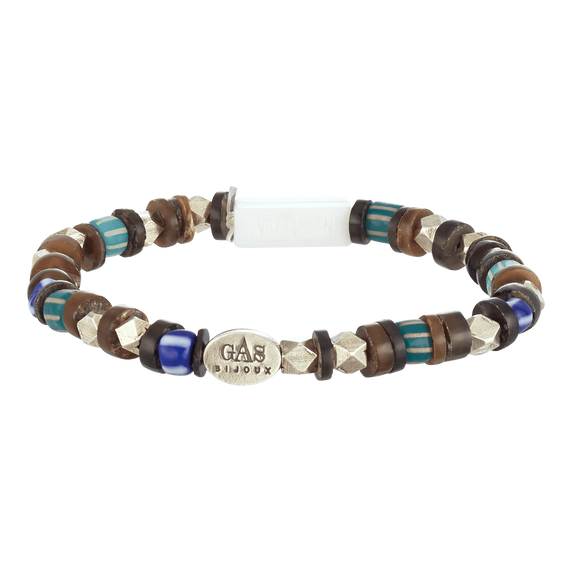 - Narukvica za muškarce i žene sastavljena od drvenih perli, kamenčića i posrebrenih perli.